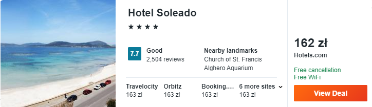 W Alghero polecam wam noclegi w 4* hotelu Soleado. Na miejscu skorzystacie z darmowego Wi-Fi. Ponadto będziecie mogli odpocząć w basenie. Obiekt zlokalizowany jest w pobliżu centrum miasta, przy samej plaży.