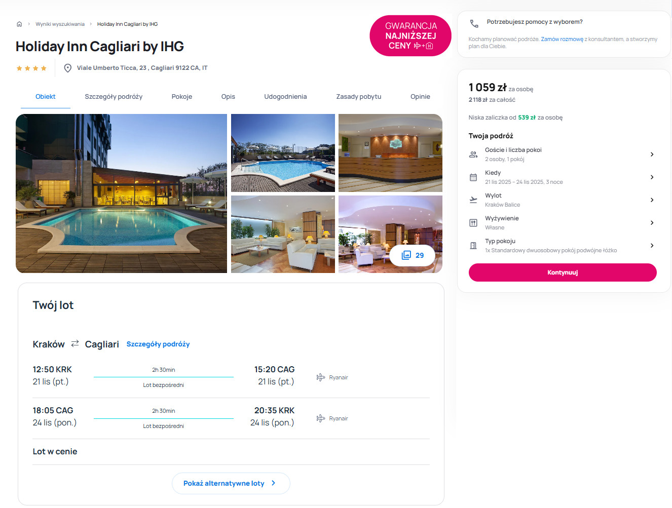 Na Sardynię wylecisz w piątek (21 listopada) z Krakowa o godzinie 12:50. W drogę powrotną do Polski wyruszysz w poniedziałek (24 listopada), a odlot zaplanowany jest na godzinę 18:05. W obie strony podróżować będziesz bezpośrednio linią Ryanair.