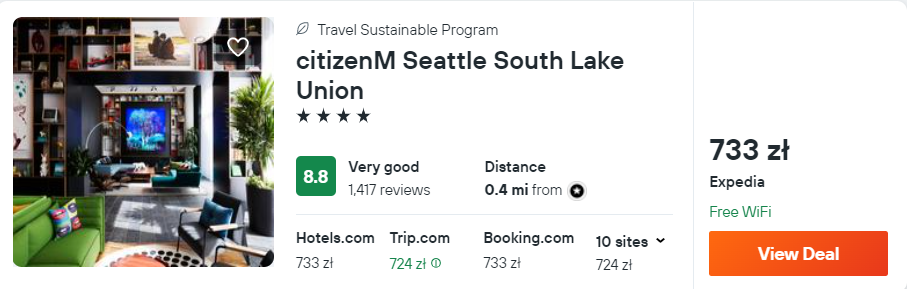 W Seattle proponuję ci noclegi w 4* hotelu citizenM Seattle South Lake Union, który od wieży Space Needle oddalony jest o 5 minut spokojnego spaceru. Na terenie obiektu znajduje się dobrze wyposażone centrum fitness, a we wszystkich pomieszczeniach będziesz mieć zapewniony dostęp do sieci WiFi.