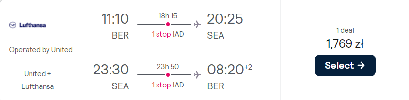 Twoja podróż do Stanów Zjednoczonych odbędzie się w terminie 14-30 września, kiedy to polecisz z Berlina do Seattle. Po drodze zaplanowano bezpieczne przesiadki w Waszyngtonie. W dniach 16-26 września udasz się na wycieczkę do Missoula, który jest idealną bazą wypadową do zwiedzania Parku Narodowego Glacier. Podróżować będziesz na pokładzie samolotów linii lotniczych United, Lufthansa i Alaska Airlines.