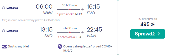 Na wycieczkę do Hiszpanii polecicie z warszawskiego lotniska im. Fryderyka Chopina. Czeka was podróż na pokładzie samolotów 5* linii lotniczej Lufthansa (najwyższa ocena w prestiżowym rankingu Skytrax). Po drodze zaplanowano bezpieczne, gwarantowane przez przewoźnika przesiadki w Monachium i Frankfurcie.