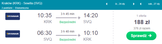 - Loty z Krakowa do Sewilli za 376 PLN/2 osoby (188 PLN/osoba)