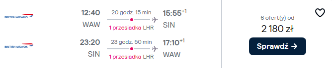 Czeka cię podróż z British Airways z przesiadkami w Londynie. Najtańsze bilety zarezerwujesz od 2155 PLN, a nie lada gratką będzie przelot Airbusem A380 (największym pasażerskim samolotem świata) na trasie Londyn-Singapur.