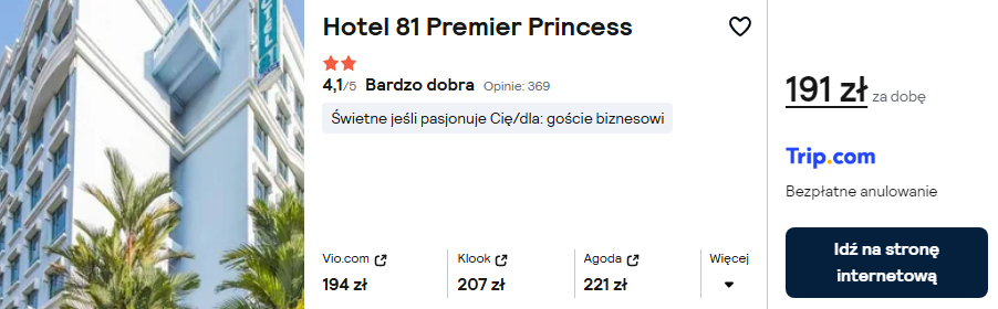 Potrzebujesz jednak nieco wyższego standardu? Dobrym wyborem będą noclegi w hotelu 81 Premier Princess, który oferuje rozsądny kompromis między ceną, a jakością.