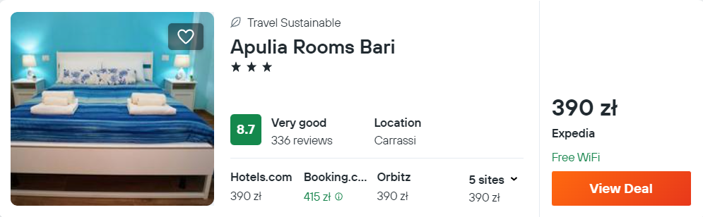 W Bari polecam 3* hotel Apulia Rooms. Obiekt jest bardzo dobrze oceniany przez dotychczasowych gości i będzie świetną bazą wypadową do zwiedzania Apulii.