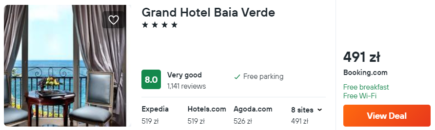 Natomiast na Sycylii wybrałem dla ciebie 4* Grand Hotel Baia Verde. Z obiektu rozpościerają się malownicze widoki na morze. Do twojej dyspozycji zostanie oddany basen i strefa relaksu. W cenę zakwaterowania wliczono śniadania.