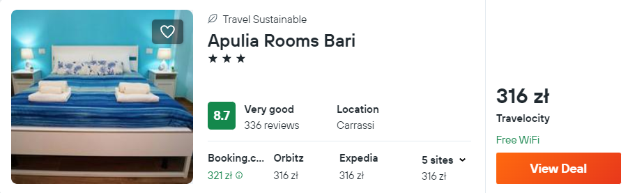 W Bari polecam 3* hotel Apulia Rooms. Obiekt jest bardzo dobrze oceniany przez dotychczasowych gości i będzie świetną bazą wypadową do zwiedzania Apulii.