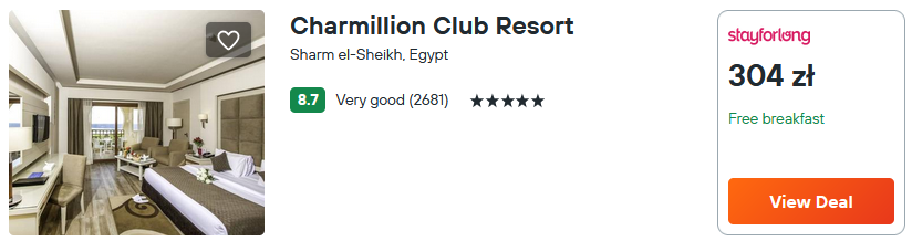 W egipskim kurorcie Szarm el-Szejk, postaw na luksusowy 5* hotel Charmillion Club. Znajdziesz w nim m. in. centrum spa, korty tenisowe i siłownię. Obiekt posiada dostęp do prywatnej plaży. W cenę noclegu wliczone zostały śniadania.