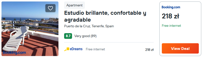 Na Teneryfie wybierz bardzo dobrze oceniany apartament Estudio brillante. Obiekt posiada własny taras z którego rozciąga się piękny widok, a także w pełni wyposażoną kuchnię oraz basen.