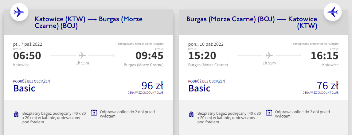 Wycieczka do Bułgarii zaplanowana została w dogodnym okołoweekendowym terminie 7 – 10 października (piątek – poniedziałek). Czeka was bezpośredni lot z Katowic do Burgas, realizowany na pokładzie samolotu linii lotniczej Wizz Air. Bilety w najniższej cenie zakupią posiadacze Wizz Discount Club, pozostałe osoby zapłacą nieco więcej.