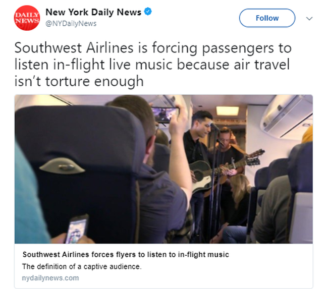 Jakby podróż samolotem nie była wystarczającą torturą, Southwest będzie zmuszał pasażerów do słuchania muzyki – tweetuje New York Daily News, a magazyn „Vice” dodaje, że pasażerowie są uwięzieni i nie mają dokąd uciec.