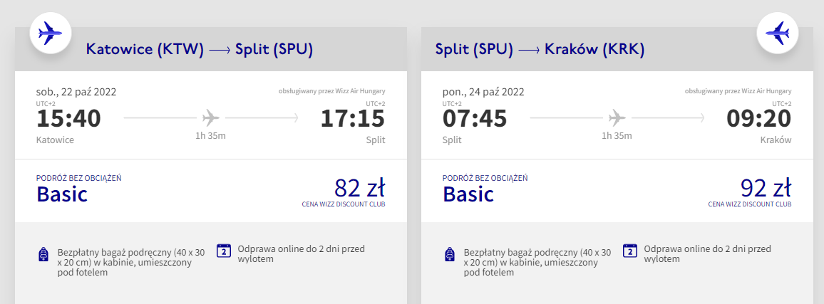 Do Chorwacji wybierzecie się w terminie 22 – 24 października (sobota – poniedziałek). Czeka was bezpośredni lot z Katowic do Splitu, realizowany na pokładzie samolotu linii lotniczej Wizz Air. Pamiętajcie, że bez dodatkowych opłat możecie zabrać jedynie bagaż podręczny. Bilety w najniższej cenie zakupią członkowie Wizz Discount Club, pozostałe osoby zapłacą nieco więcej.