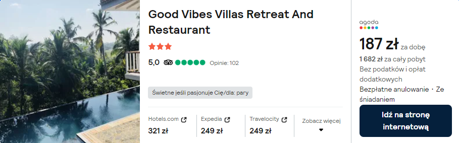 W Sri Lance polecam noclegi w 4* hotelu Good Vibes Villas. Na miejscu znajdziesz basen zewnętrzny i komfortowo urządzony pokój. W cenę zakwaterowania wliczono codzienne śniadania.