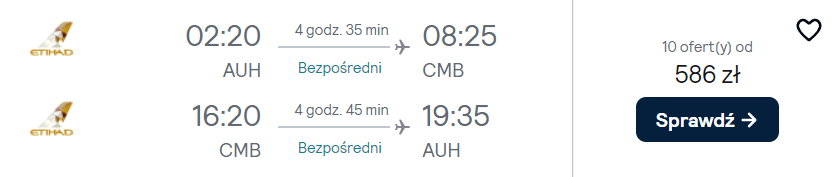 Wycieczka składa się z dwóch oddzielnych rezerwacji przelotów na trasach Kraków-Abu Zabi-Kraków oraz Abu Zabi-Kolombo-Abu Zabi. W każdym z miejsc spędzisz wystarczająco dużo czasu, który pozwoli pozwiedzać, jak i się zrelaksować.