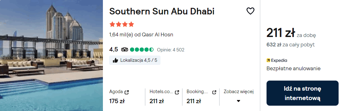 Natomiast w Abu Zabi postaw na pobyt w 4* hotelu Southern Sun Abu Dhabi, z odkrytym basenem na dachu. Na terenie całego obiektu będziesz miał zapewniony dostęp do sieci WiFi.