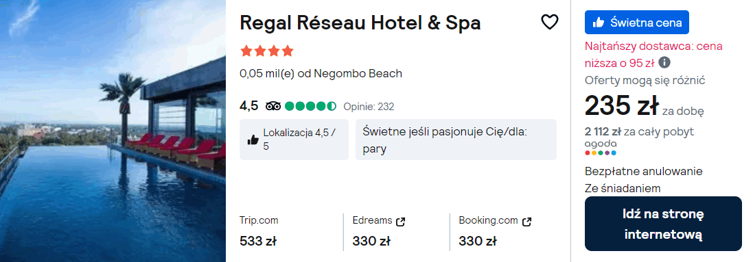 Możesz także zatrzymać się w 4* Regal Réseau Hotel & Spa z odkrytym basenem na dachu. Na miejscu zapewniony będziesz miał dostęp do sieci WiFi. Znajduje się on w miejscowości Negombo.