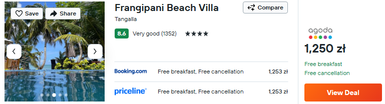 Wybrałem noclegi w miejscowości Tangalla. Zatrzymaj się tam w położonym tuż przy plaży 4* hotelu Frangipani Beach Villa. W cenę pobytu wliczone są codzienne śniadania.