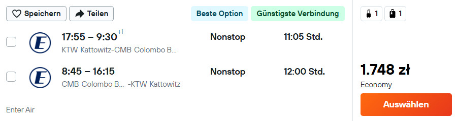 Do Kolombo polecisz z Katowic, Poznania oraz Warszawy. Na każdej trasie podróżować będziesz czarterową linią Enter Air z międzylądowaniem w Zjednoczonych Emiratach Arabskich (odbywa się ono bez opuszczania samolotu). W cenie zabrać ze sobą możesz bagaż rejestrowany (nadawany do luku) oraz podręczny.