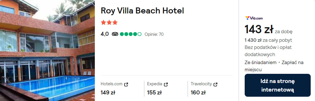 Tyle samo przyjdzie ci zapłacić za noclegi w 3* hotelu Roy Villa Beach, który znajduje się tuż przy plaży Payagala. W cenie zapewniony będziesz mieć dostęp do odkrytego basenu, sieci WiFi oraz codzienne śniadania.