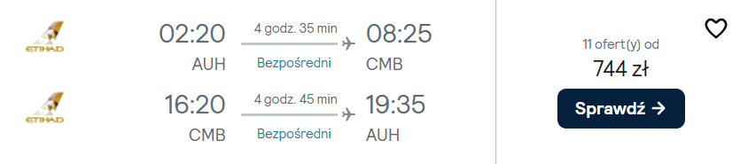 Rewelacyjną cenę (1459 PLN) otrzymasz, decydując się na podróż składającą się z dwóch niezależnych przelotów na trasach: Kraków-Abu Zabi-Kraków oraz Abu Zabi-Kolombo-Abu Zabi.