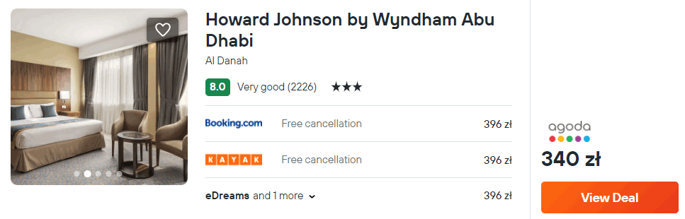 Natomiast w Abu Zabi proponuję ci zakwaterowanie w 3* hotelu Howard Johnson by Wyndham, który od plaży oddalony jest o 5 minut spokojnego spaceru. Na miejscu zapewniony będziesz miał dostęp do centrum fitness oraz sieci WiFi.