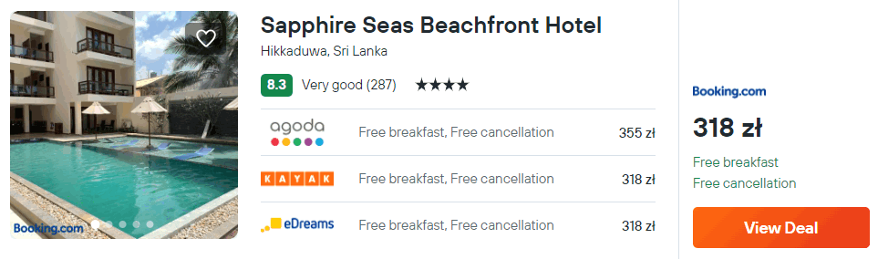 W pierwszym przypadku poleciesz bezpośrednio linią Wizz Air. Natomiast na wyspę Cejlon udasz się linią Etihad Airways (również bezpośrednio). Do zakupu biletów nie będziesz potrzebować żadnych klubów zniżkowych. Bez dodatkowych kosztów na wycieczkę udasz się z bagażem podręcznym.