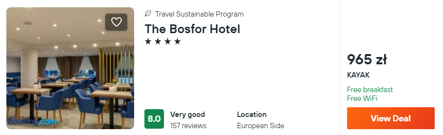 W Stambule zatrzymasz się w 4* hotelu The Bosfor, który od takich zabytków jak: Hagia Sophia czy Błękitny Meczet oddalony jest o 2 km. Z lotniska do miejsca noclegowe dojedziesz taksówką za ok. 100 PLN lub komunikacją miejską – więcej informacji na ten temat znajdziesz w tym wątku na forum.