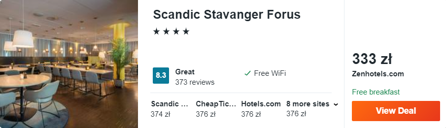 Skorzystajcie z okazji i zatrzymajcie się w świetnie ocenianym 4* hotelu Scandic Stavanger Forus. Wszystkie pokoje w obiekcie są klimatyzowane, posiadają prywatne łazienki oraz bezpłatny dostęp do internetu. Co więcej, w cenę pobytu wliczone jest smaczne śniadanie.