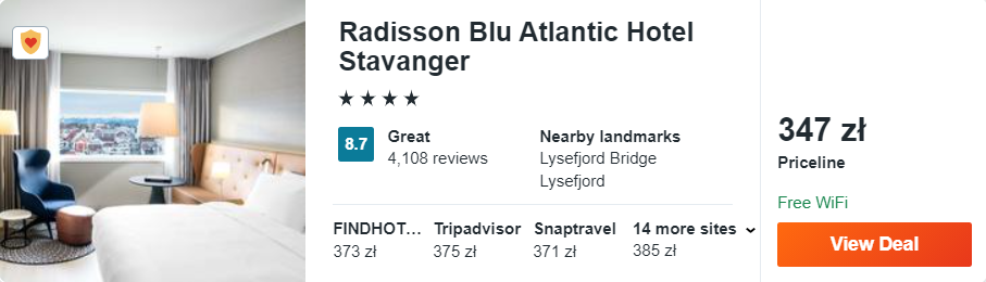 Dowiedzcie się więcej o tym hoteluAtrakcyjnie wygląda także oferta 4* Radisson Blu Atlantic, który może pochwalić się nie tylko świetnymi ocenami dotychczasowych gości, ale też… przepiękną górską panoramą! Pobyt w tym obiekcie ułatwi wam również zwiedzanie miasta – zaledwie 250 m będzie dzieliło was od jego starej części.