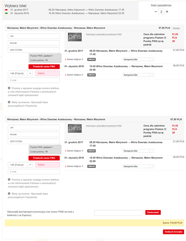 - Przejazdy z Warszawy do Wilna (30 grudnia – 1 stycznia) linią Lux Express za 146 PLN/2 osoby (73 PLN/osoba).