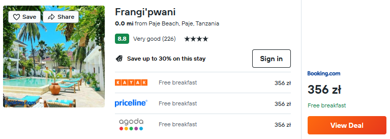 Oczekujesz wyższego standardu? Zarezerwuj świetny 4* hotel Frangi’pwani. Na dobry początek dnia otrzymasz tam pyszne śniadanie wliczone w cenę zakwaterowania.