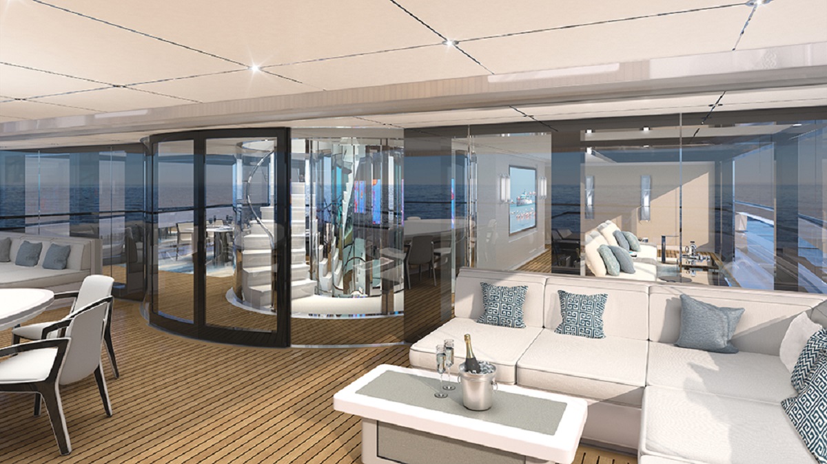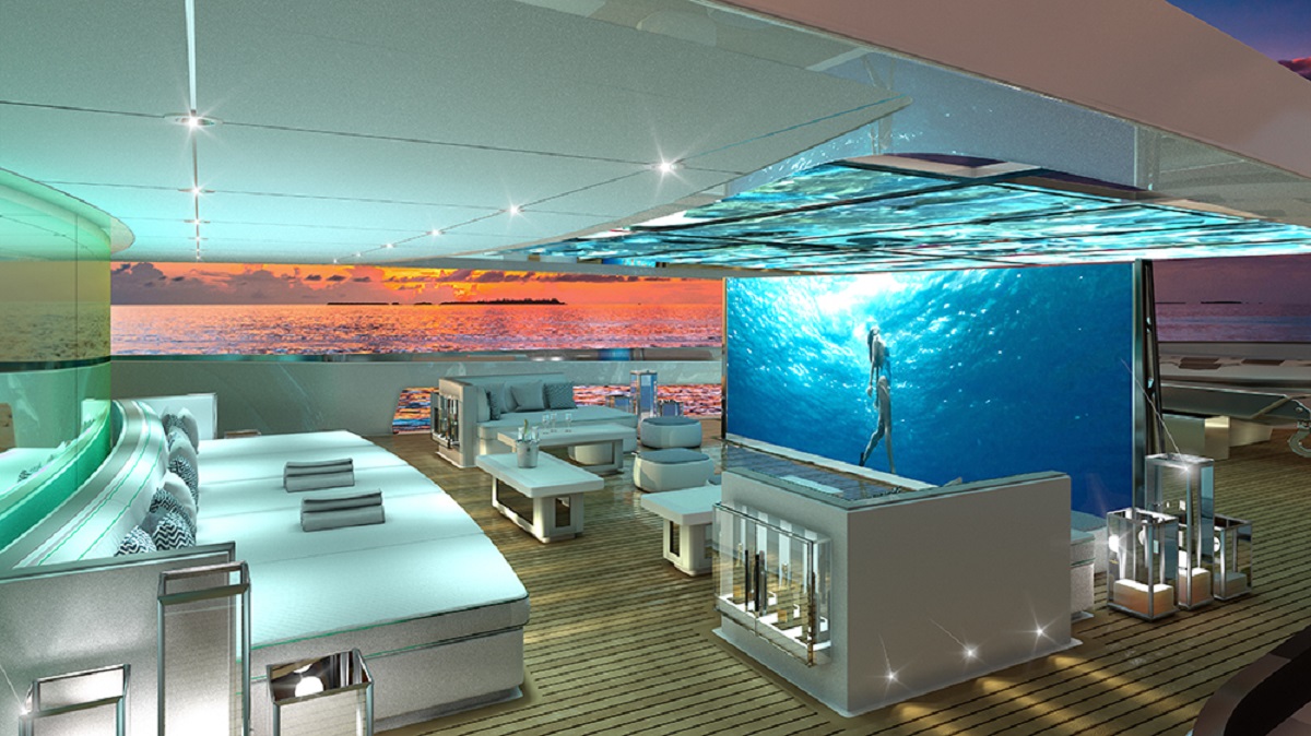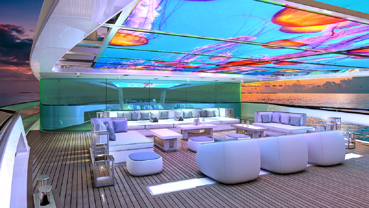 Przede wszystkim jacht ma według projektu 65 metrów długości. Większość pomieszczeń jest przeszklona – tak by z niemal każdego miejsca można było oglądać to, co nas otacza. Ale nie w drugą stronę, bowiem zastosowane szkło działa jak lustro fenickie. Prywatność jest więc gwarantowana. Nie ma tu też zbyt wielu ścian, bo całe wnętrze jachtu ma tworzyć otwartą przestrzeń. Oczywiście poza kabinami, których ma się tutaj znaleźć sześć. To oznacza, że na pokład może wejść 14 gości. Dodatkowo, żebyśmy nie musieli się niczym przejmować zaplanowano miejsce dla 17-osobowej (!) załogi.