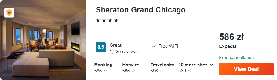 Dowiedzcie się więcej o tym hoteluNatomiast wszystkim tym, którzy są w stanie wydać nieco więcej na noclegi, rekomenduję zakwaterowanie w 4* hotelu Sheraton Grand Chicago, który znajduje się w samym sercu miasta. Wszystkie pokoje wyposażone zostały w liczne udogodnienia, na które składają się m.in: klimatyzacja, telewizor LCD, minibar, sejf, czajnik elektryczny oraz radio. Z każdego rozpościera się widok na rzekę lub miasto.