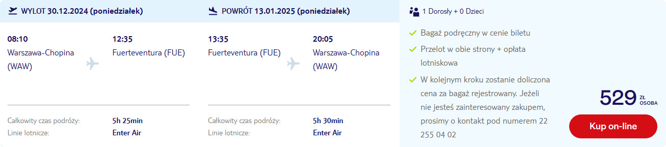 Na Gran Canarię wybrać możesz się z Katowic oraz Poznania, na Fuerteventurę polecisz z Warszawy, natomiast na Lanzarote podróżować będziesz z Wrocławia. Na każdej trasie operuje czarterowy przewoźnik Enter Air. Bez dodatkowych kosztów do Hiszpanii udasz się z bagażem podręcznym.