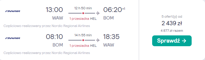 W podróż do Azji udasz się w terminie 5(6) – 13 marca. Czekają cię loty z Warszawy do Bombaju, realizowane na pokładzie samolotów linii lotniczej FInnair. Po drodze zaplanowano przesiadki w Helsinkach, a bez dodatkowych opłat polecisz z bagażem podręcznym.