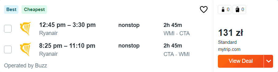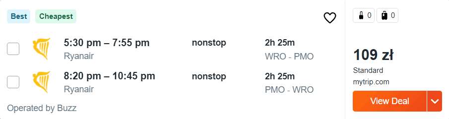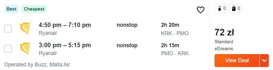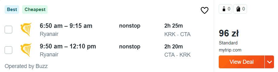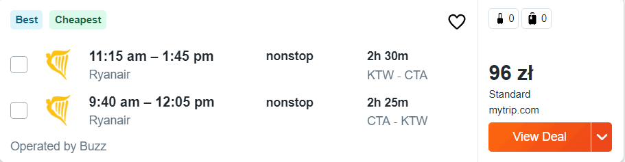 Na wszystkich trasach polecicie bezpośrednio na pokładach samolotów linii Ryanair z wliczonym małym bagażem podręcznym, a za bilety na Sycylię (i z powrotem) zapłacicie od 72 do 166 PLN.