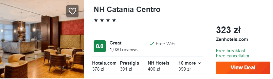 W Katanii rekomenduję wam noclegi z codziennymi śniadaniami w 4* hotelu NH Catania Centro, który znajduje się w odległości 10 minut spokojnego spaceru od centrum miasta. Wszystkie pokoje są klimatyzowane i w każdym jest łazienka z wanną i prysznicem.