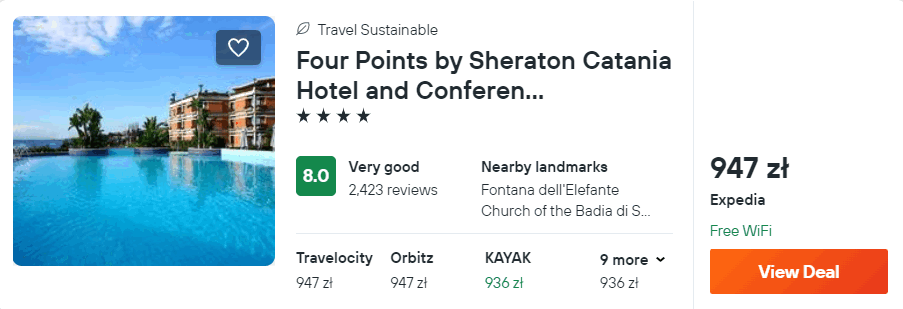 Na Sycylii zatrzymasz się w fantastycznym 4* hotelu Four Points by Sheraton, który znajduje się w spokojnej części Katanii. Z lotniska w okolice miejsca noclegowego dojedziesz komunikacją publiczną (autobus + pociąg) lub wypożyczonym samochodem – szczegóły poniżej.