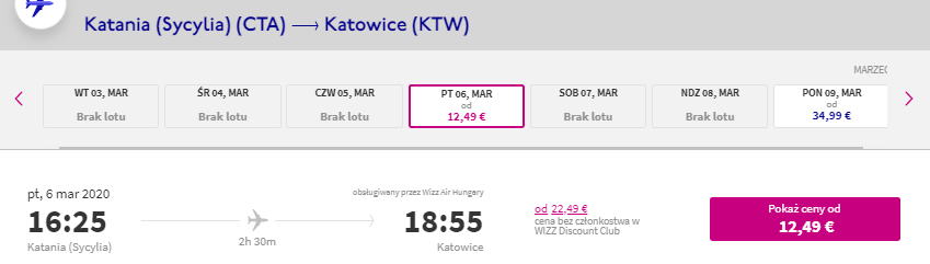 Do Katanii polecicie w terminie terminie 4 – 6 marca liniami Ryanair oraz Wizz Air. Pamiętajcie, że bilety będziecie musieli zarezerwować osobno. W najniższej cenie polecą posiadacze Wizz Discount Club. Na pokład samolotu zabierzecie tylko bagaż podręczny. Sprawdźcie nasze porady jak się spakować.