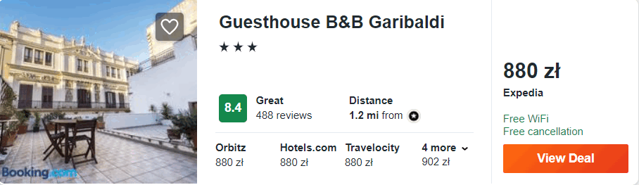 W Trapani proponuję wam noclegi w hotelu apartamentowym – Guesthouse B&B Garibaldi. Wszystkie studia posiadają prywatną łazienkę z wanną lub prysznicem. W każdym pokoju znajduje się klimatyzacja, telewizor LCD oraz czajnik elektryczny. Na terenie całego obiektu będziecie mieli zapewniony dostęp do sieci WiFi.