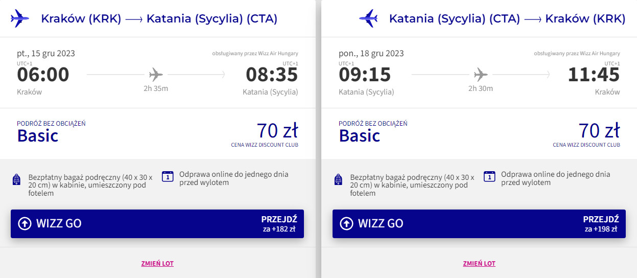 Na Sycylię udasz się z krakowskiego lotniska w Balicach w terminie 15-18 grudnia (piątek-poniedziałek). W obie strony podróżować będziesz na pokładzie samolotu linii Wizz Air z wliczonym małym bagażem podręcznym. Bilety w najniższej cenie dostępne są dla członków Wizz Discount Club. Chętni na loty bez WDC zapłacą więcej.