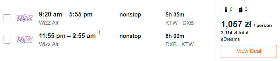 Do Zjednoczonych Emiratów Arabskich udacie się w dogodnym terminie obejmującym sylwestra, Nowy Rok oraz święto Trzech Króli (31 grudnia-7 stycznia). Do Dubaju polecicie z katowickiego lotniska w Pyrzowicach. W obie strony podróżować będziecie na pokładach samolotów linii Wizz Air z wliczonym małym bagażem podręcznym. Za możliwość zabrania ze sobą dwóch bagaży podręczny (usługa WIZZ Priority) zapłacicie dodatkowe 53 PLN/osoba/w jedną stronę.