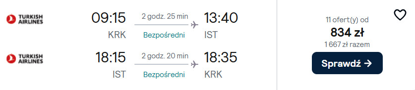 Do Stambułu wylecisz we wtorek (30 grudnia) z Krakowa o 9:15. W drogę powrotną do Polski wyruszysz w czwartek (1 stycznia), a odlot zaplanowany jest na godzinę 18:15. W obie strony podróżować będziesz bezpośrednio linią Turkish Airlines.