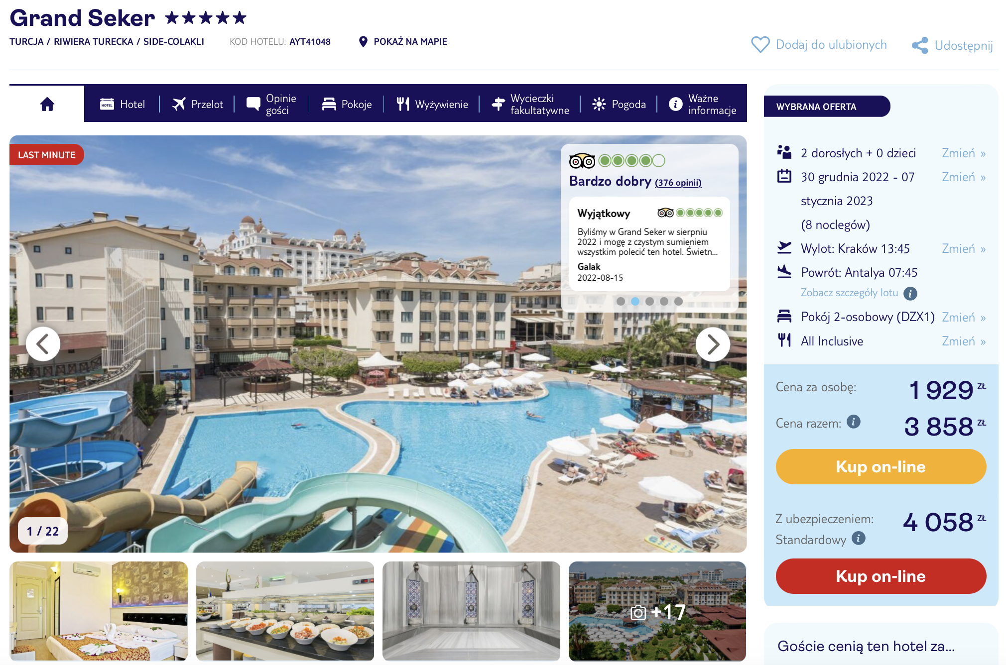 5* Grand Seker, w którym spędzisz tydzień, położony jest 300 metrów od piaszczystej plaży. W hotelu do twojej dyspozycji będzie kryty basen, siłownia i kort tenisowy. Każdy pokój wyposażony jest w minibar, telewizor, WiFi i prywatną łazienkę z bezpłatnym zestawem kosmetyków.