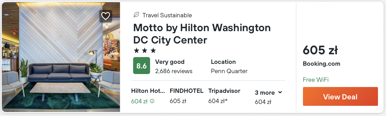 Natomiast w Waszyngtonie polecam zatrzymać się w Motto by Hilton DC City Center, który położony jest w dzielnicy Penn Quarter, naprzeciwko stacji metra Gallery Place/Chinatown.