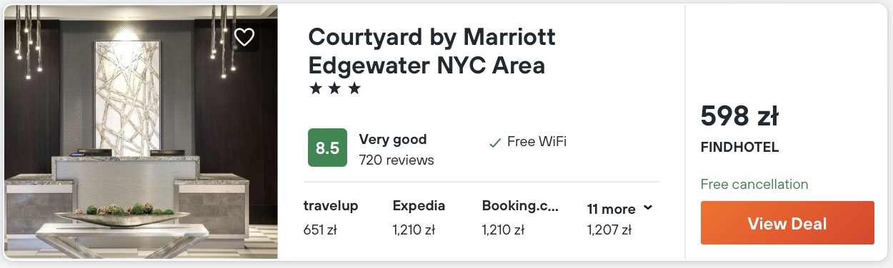 W Nowym Jorku rekomenduję noclegi w Courtyard by Marriott Edgewater NYC Area, który jest dobrze skomunikowany z Manhattanem.