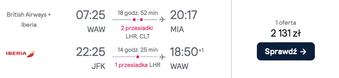 Na Florydę polecisz 26 grudnia z Warszawy. Po drodze czeka cię przesiadka w Londynie i Charlotte. 2 stycznia udasz się do Nowego Jorku. Powrót do Polski zaplanowałem na 7 stycznia. Podróżować będziesz liniami lotniczymi British Airways, Iberia i United. W cenę wliczony jest bagaż podręczny.