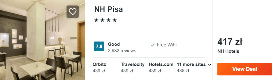 Natomiast w Pizie proponuję wam noclegi w 4* hotelu NH Pisa, który znajduje się w samym centrum miasta, tuż przy dworcu kolejowym.