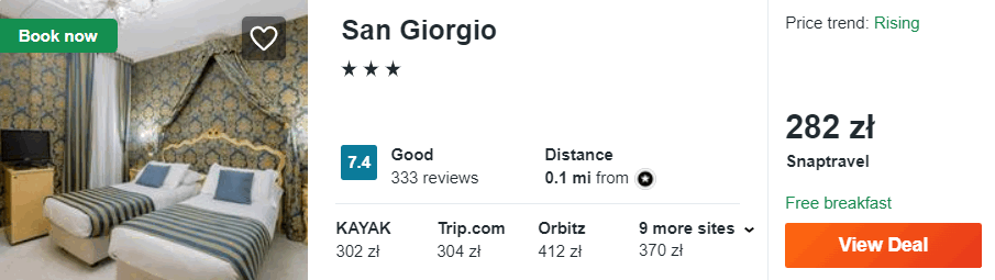 W Wenecji proponuję wam noclegi z codziennymi śniadaniami w 3* hotelu San Giorgio, który znajduje się w sąsiedztwie Canal Grande oraz placu Świętego Anioła.