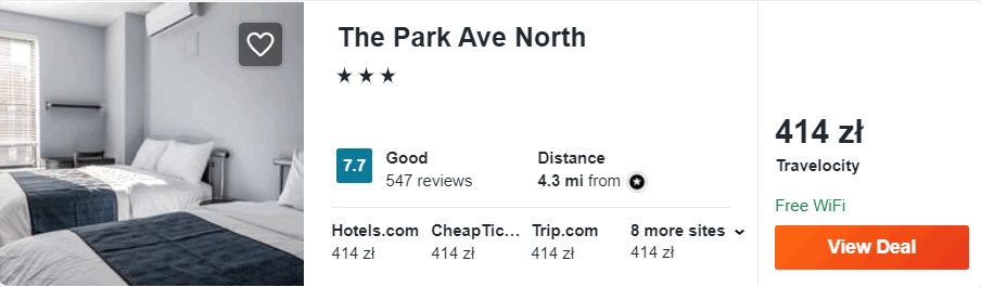 W Nowym Jorku proponuję wam noclegi w 3* hotelu The Park Ave North, który znajduje się w odległości 1,5 km od słynnego Central Parku. W każdym pokoju jest łazienka z wanną i prysznicem, a na terenie całego obiektu zapewniony będziecie mieli dostęp do sieci WiFi.